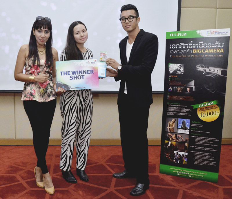 | คุณนิวรรณ เตือนใจยา ผู้จัดการฝ่ายการตลาด บริษัท บิ๊ก คาเมร่า จำกัด(ซ้าย)และ คุณแทม พศิน อัธยาตมวิทยา วิทยากรประจำการอบรม(ขวา) มอบรางวัลให้กับคุณพนิดา การนา ผู้ชนะเลิศรางวัล The Turn Pro (ที่สองจากซ้าย) |