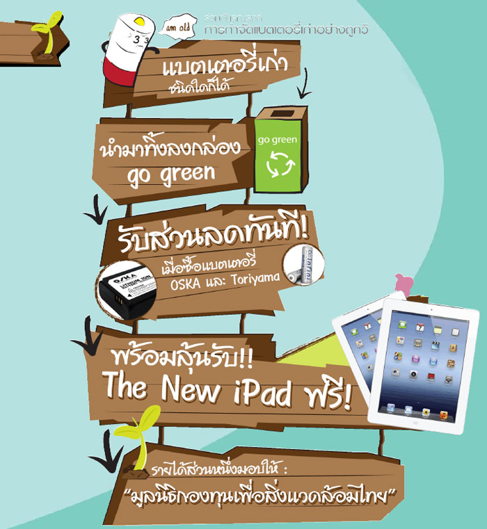 BIG Camera ศูนย์รวมกล้องดิจิตอลที่มีความสุขให้เลือกมากที่สุด ร่วมกับ บริษัท ออสก้า โฮลดิ้ง จำกัด นำโดย คุณชิตชัย เธียรกาญจนวงศ์ ผู้จัดการทั่วไป บริษัท บิ๊กคาเมร่า จำกัด และคุณบุษราภรณ์ พรไพศาลศักดิ์ กรรมการผู้จัดการ บริษัท ออสก้า โฮลดิ้ง จำกัด เปิดโครงการ GO Green “คืนแบต คืนโลก” ปี 3 รณรงค์ให้ประชาชนมาร่วมกันทิ้งแบตเตอรี่ที่เสื่อมสภาพหรือไม่ใช้แล้วอย่างถูกวิธี และลุ้นรับ The New ipad ส่งคืน ณ จุดรับที่ BIG Camera 200 สาขา ทั่วประเทศ เพื่อนำกลับมาทำลายอย่างถูกวิธี และไม่เป็นพิษต่อสิ่งแวดล้อม ขอเชิญชวนประชาชนทั่วไปที่มีแบตเตอรี่ที่เสื่อมสภาพหรือไม่ใช้แล้ว มาทิ้งลงในกล่องบรรจุที่จัดเตรียมไว้ ณ จุดรับที่ BIG Camera 200 สาขา ทั่วประเทศ พร้อมกับลุ้นรับฟรี The new iPad และรางวัลอื่นๆ อีกมากมาย มูลค่ารวมมากกว่า 200,000 บาท ได้ตั้งแต่วันนี้จนถึงวันที่ 31 ตุลาคมนี้ เท่านั้น สอบถามรายละเอียดเพิ่มเติม บริษัท ออสก้า โฮลดิ้ง จำกัด โทร. 02-730-0022 |