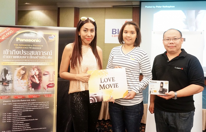 | คุณเพ็ญรุ่ง หุ้นเลิศสกุล (ที่สองจากซ้าย) ผู้ชนะเลิศการประกวดภาพรางวัล LOVE MOVIE โดยมี คุณนิวรรณ เตือนใจยา ผู้จัดการแผนกการตลาดและสื่อสารองค์กร บริษัท บิ๊ก คาเมร่า คอร์ปอเรชั่น จำกัด (มหาชน)(ซ้าย) และ คุณบวรเกียรติ ไชยสุริยานันท์ Product Manager บริษัท พานาโซนิค ซิว เซลส์ (ประเทศไทย) จำกัด (ขวา) ร่วมถ่ายภาพแสดงความยินดี |